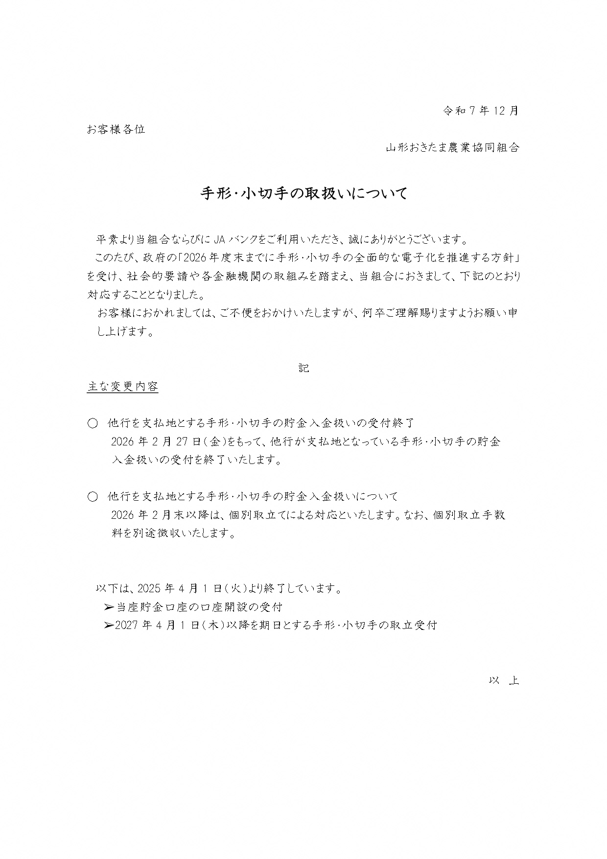 > 手形・小切手の取扱いについて